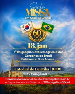 No domingo (18), às 10h, será celebrada uma Missa bilíngue em ação de graças na Catedral Metropolitana de Curitiba, presidida pelo Bispo Auxiliar da Arquidiocese, Dom Adenis Roberto Oliveira. A Celebração será transmitida ao vivo pela TV Evangelizar e pelo canal da emissora no YouTube.